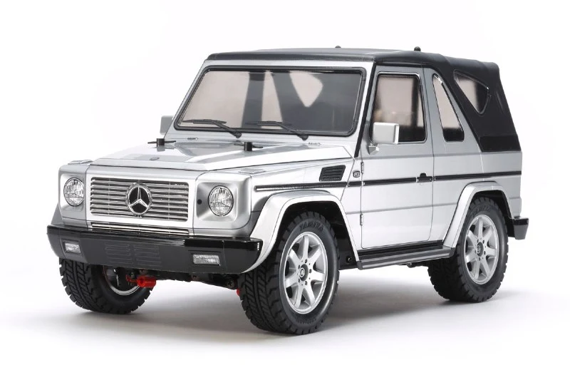 The Mercedes Benz G320 Cabrio was a G Class series vehicle that was sold between 1997 and 2001. While many G Series cars were produced, this version featured a soft convertible top and was based on a short wheelbase version of the chassis. The Tamiya radio control replica is featured on the 4WD MF-01X chassis.